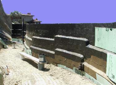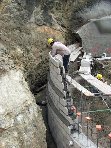 It is the rebar inside the CMU blocks that gives the retaining wall its strength. Retaining walls are built in increments of not to exceed four vertical feet, to ensure that the grout completely fills the voids inside the blocks.
